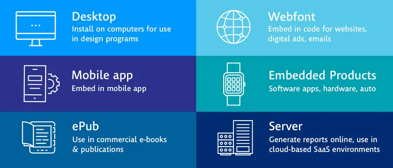 Die meisten Schriftlizenzen fallen in eine dieser Kategorien. Wir können Ihnen bei der Wahl der richtigen helfen und sicherstellen, dass Sie die Richtlinien einer jeden Kategorie verstehen.