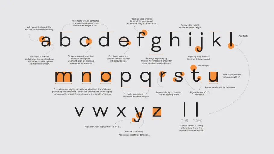 FS Meridian was the starting point for the design. Together with DesignStudio, the Studio team analysed its letter shapes and spacing, creating subtle changes such as narrowing proportions, opening character spacing, increasing ascenders and accentuating terminals — all to improve the “breathability” and readability of the typeface. These updates drew on extensive accessibility research already carried out by Monotype for brands including ING, RNIB and Mencap.