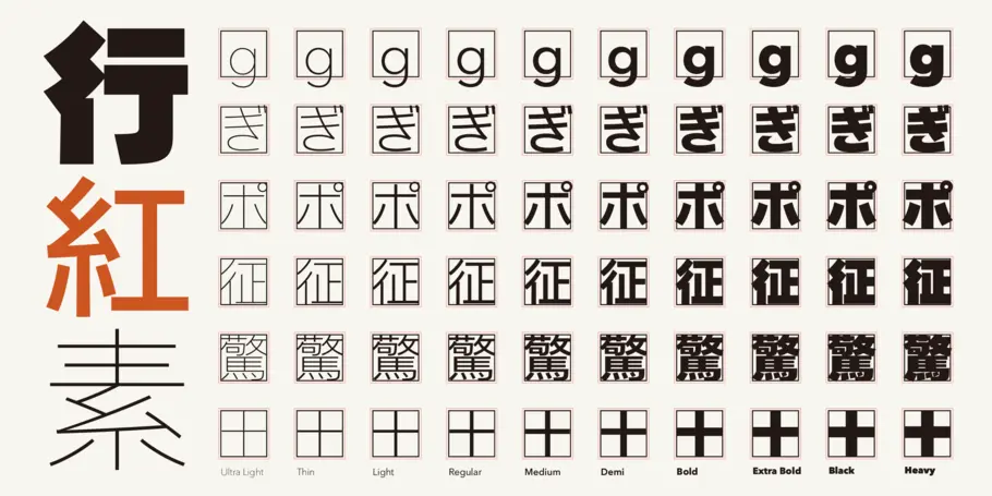 With most conventional Japanese sans serifs, almost all of the stroke beginnings and endings are visible even in the heaviest weight. In contrast, most stroke endings of Shorai are blended into adjacent strokes to achieve uncomplicated inner forms. The static Shorai font family has ten weights ranging from Ultra Light to Heavy. The Heavy variation is one of the heaviest designers can find among currently available Japanese sans serif type families. The mid-range weights of Shorai are an ideal choice for bodies of text as well as public signage. The variable font enables wide expression, allowing designers room to play while providing brands a practical toolkit with a range of static fonts.