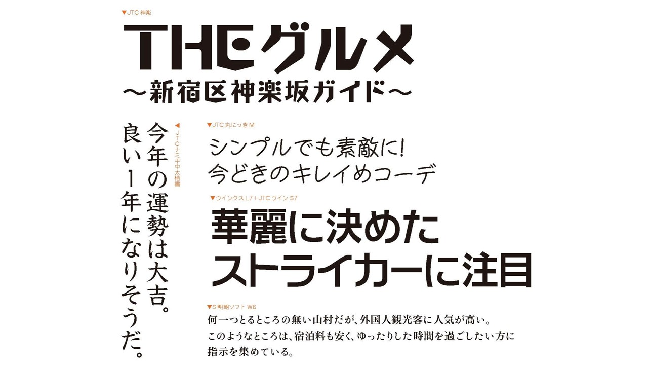 「横組みに適した“かな“」をコンセプトにした横組み専用のフォルムです。漢字とかなの横と縦のラインが美しくそろうため、番組テロップやPOPチラシにも最適。