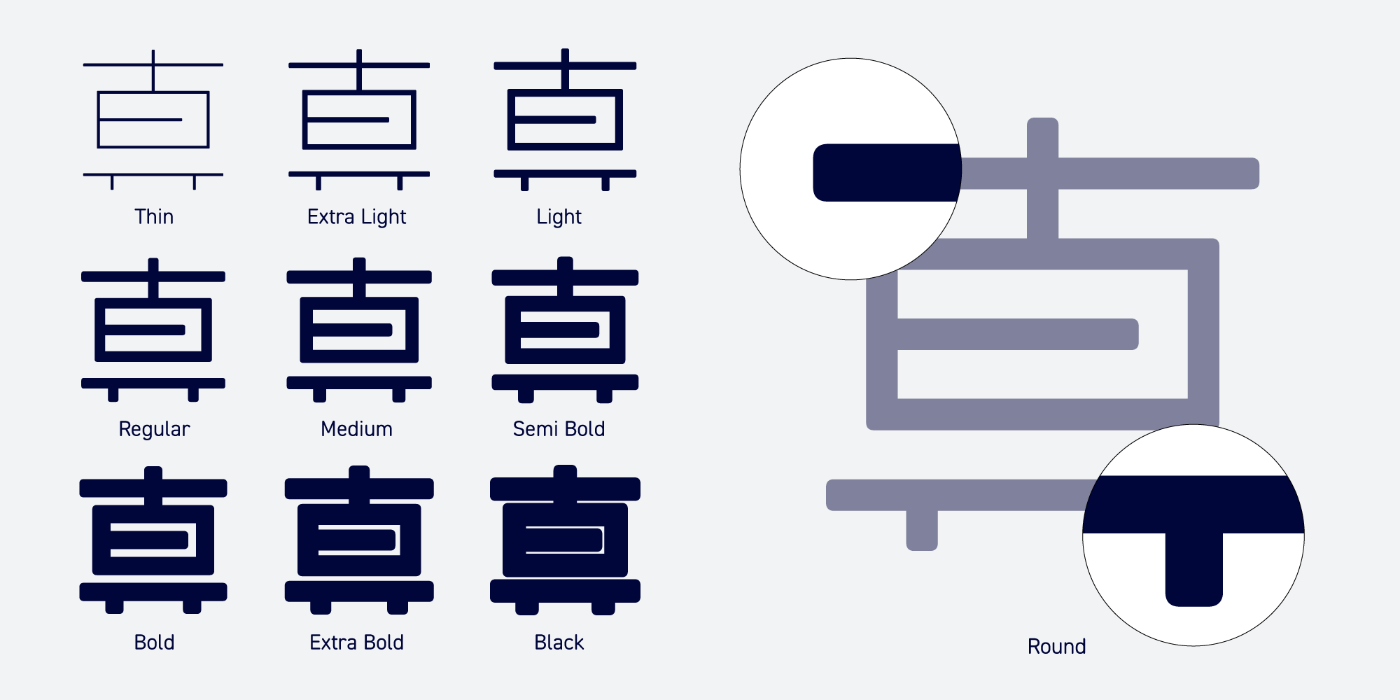 漢字の特徴を最小限の線で表現することで、簡潔さと個性を両立。ウェイトは極細(Thin)から極太(Black)までの9種類を揃え、繊細な文字組から大胆な見出しまで幅広く活用できます。また、今回はNormalとRoundの2種類をご用意致しました。