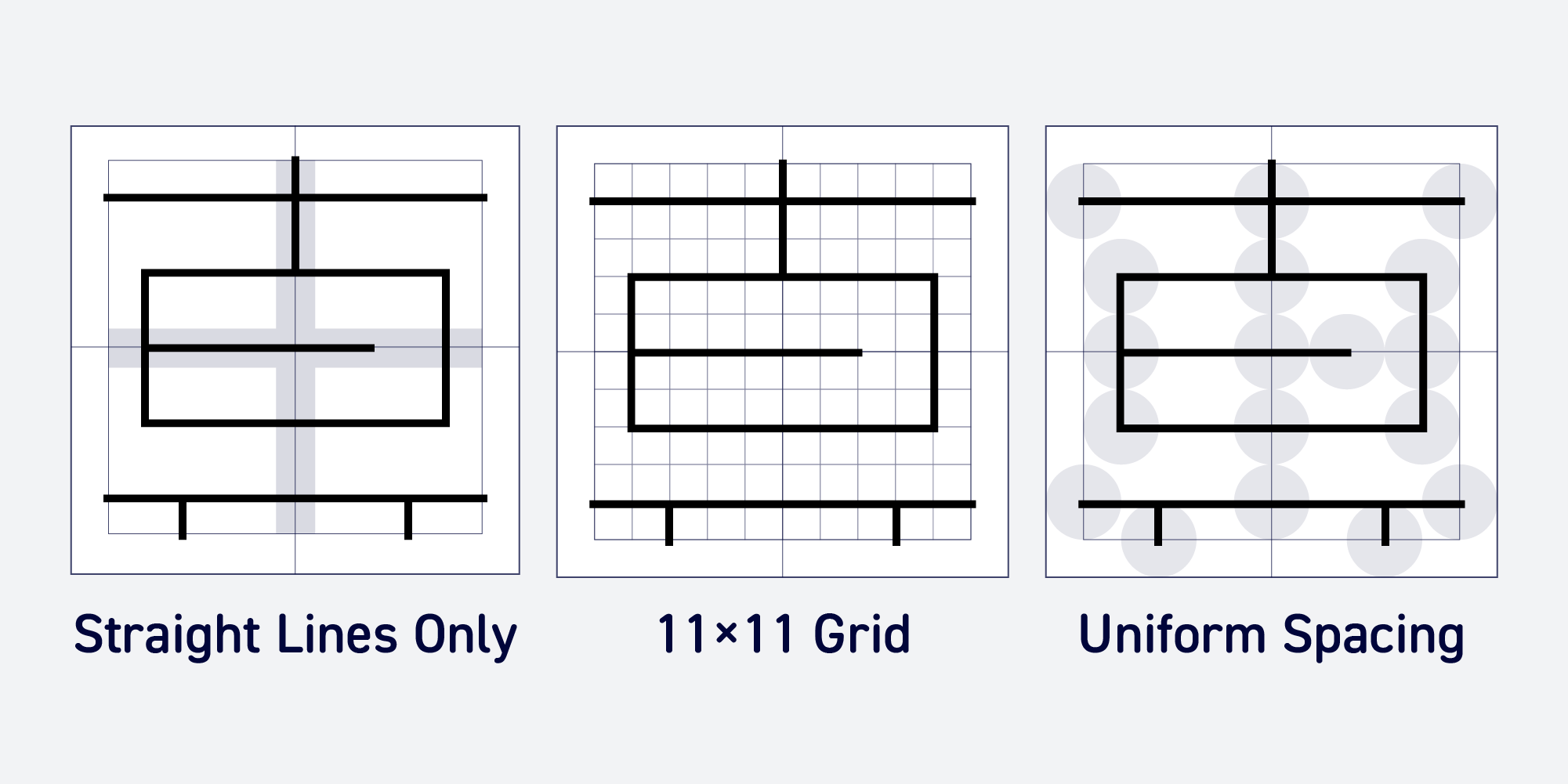 真四角書体は、江戸時代の装飾文字「角字」にインスパイアされ設計された書体です。角字が持つ直線的で幾何学的な造形を現代的に再構成し、シンプルでありながら力強い印象を生み出します。最小限の線で漢字の特徴をとらえ、簡潔さと個性を両立させることを目指しています。