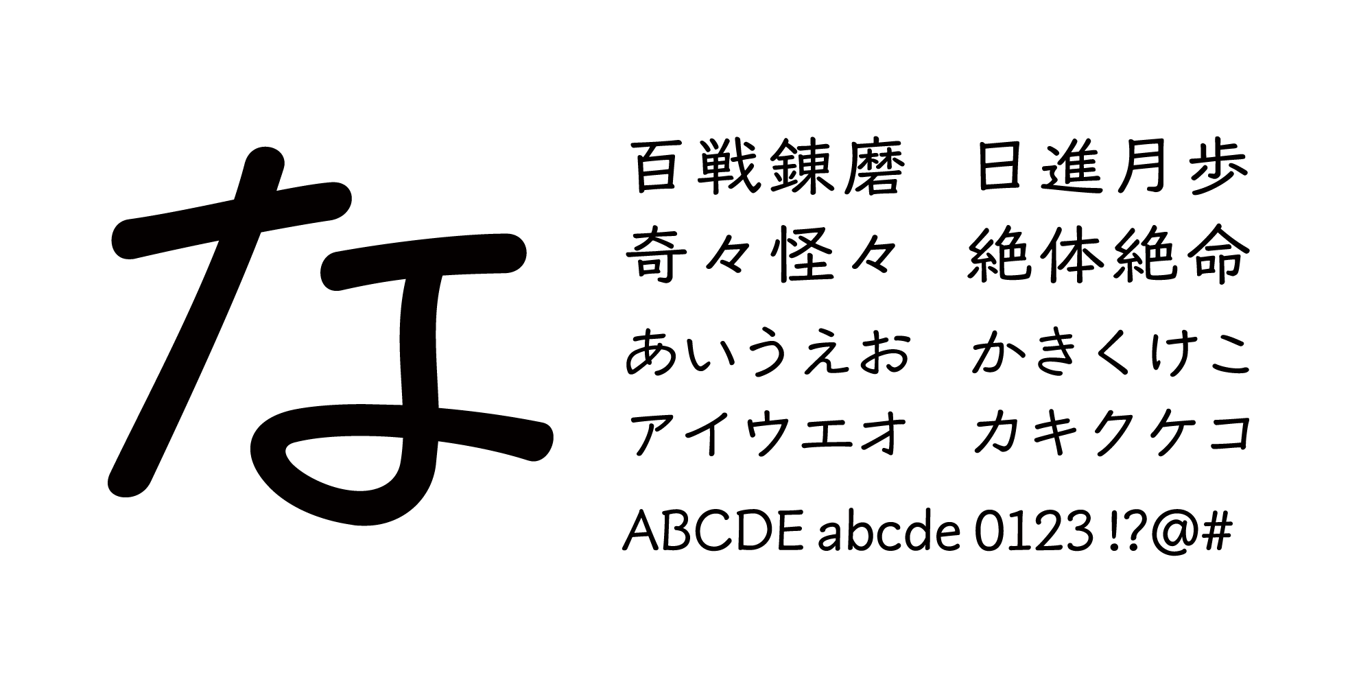 仮名は穏やかな曲線でかわいらしさを感じさせ、漢字は直線的な構造の中にやわらかさを取り入れました。欧文も日本語と調和し、デザイン全体に小さなアクセントを加えています。ファミリー向けコンテンツやキャラクターグッズ、教育分野など親しみやすく楽しい雰囲気を伝えたいデザインにおすすめです。