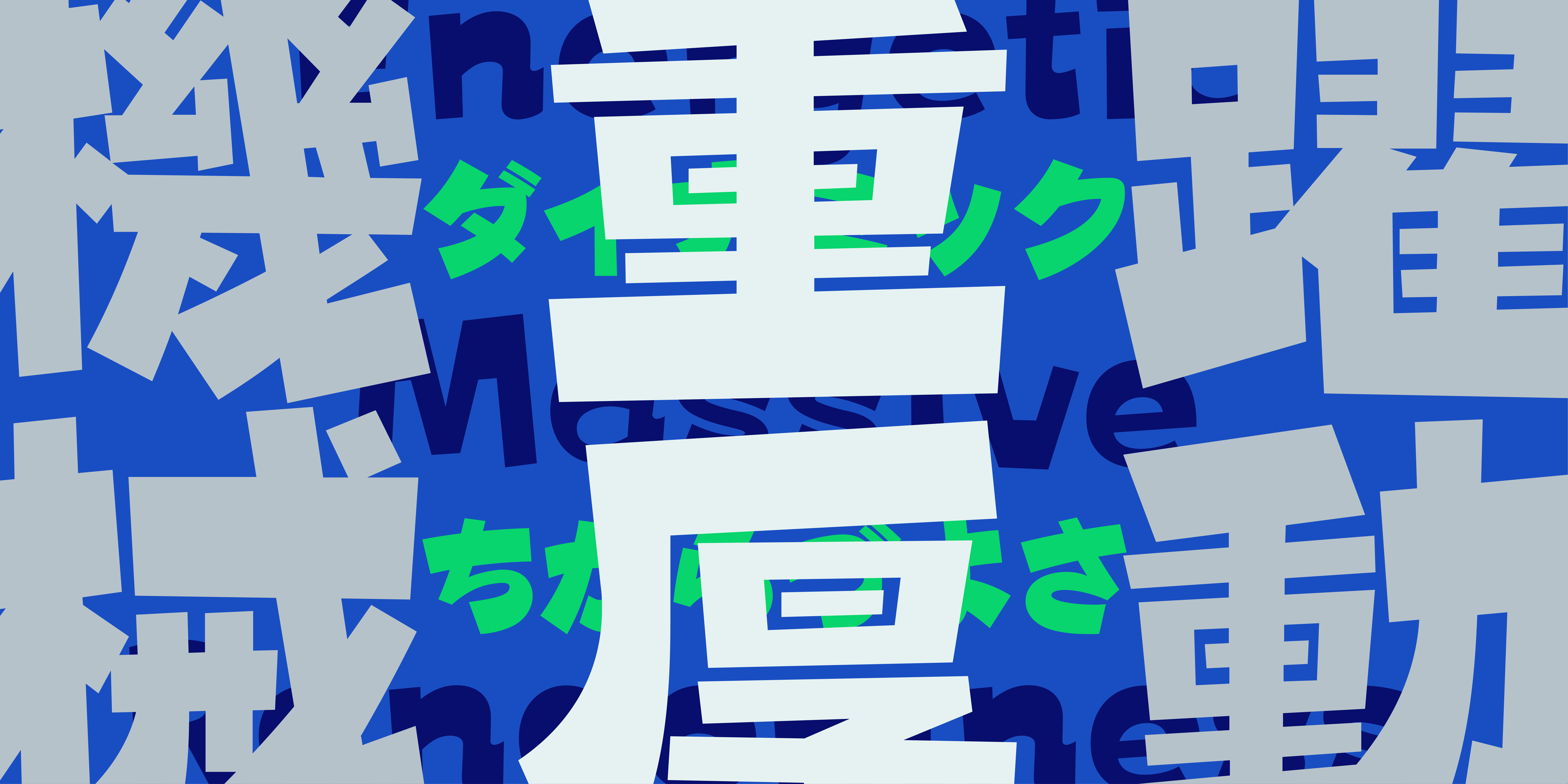 漢字の上下には極太のストロークを不規則な角度で配置しました。比較的細い中間のストロークは、関節のある手足が軽やかに多方向に動く様子を想起させます。これらの要素が融合することで、力強く、洗練された存在感を発揮します。