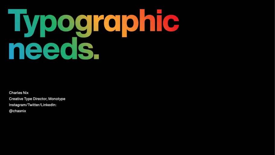 Type& 2022 Day 2、Session 1 は、Monotype クリイティブタイプディレクター、Charles Nix(チャールズ・ニックス)プレゼンテーションです。Nixは、ニューヨークを中心に活躍するクリエイティブタイプディレクター、タイポグラファーで、タイポグラフィ業界の発展を目指す国際団体、Type Directors Club の名誉会長でもあります。このセッションでは、既存のフォントを使用することから、企業が独自のフォントを持つことまでを段階的に分析しながら、Monotype が近年手掛けた大手企業のコーポレートフォントの実例を紹介しました。