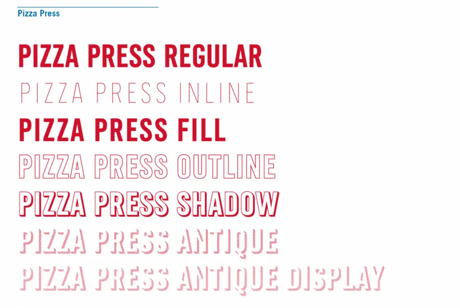 The Pizza Press typeface was based on 19th century models, in reference to the existing Trade Gothic® typeface. Other historic references helped inform the design, and Weinzierl studied finely detailed metal type specimens to see how the tiny, ray-like stripes had been created in the past. The Gill Sans® Shadow fonts were also a point of technical reference and Weinzierl explains, “a shadow design like that requires some unusual optical adjustments.” This meant that the angle and spacing of the stripes on every glyph of the shadow weights was adjusted by hand. Other detailed considerations include removing the spur from the G, to make sure the letterform could hold the Inline weight.
