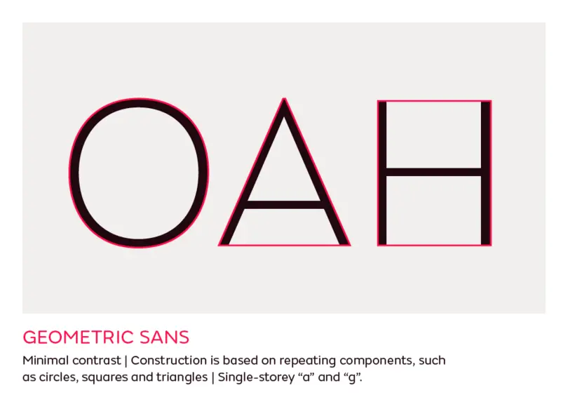 Sans serifs constructed from simple geometric shapes. Geometric fonts might seem simple and easy to design, but in reality there are lots of subtle optical adjustments to make the shapes look pure and monolinear.